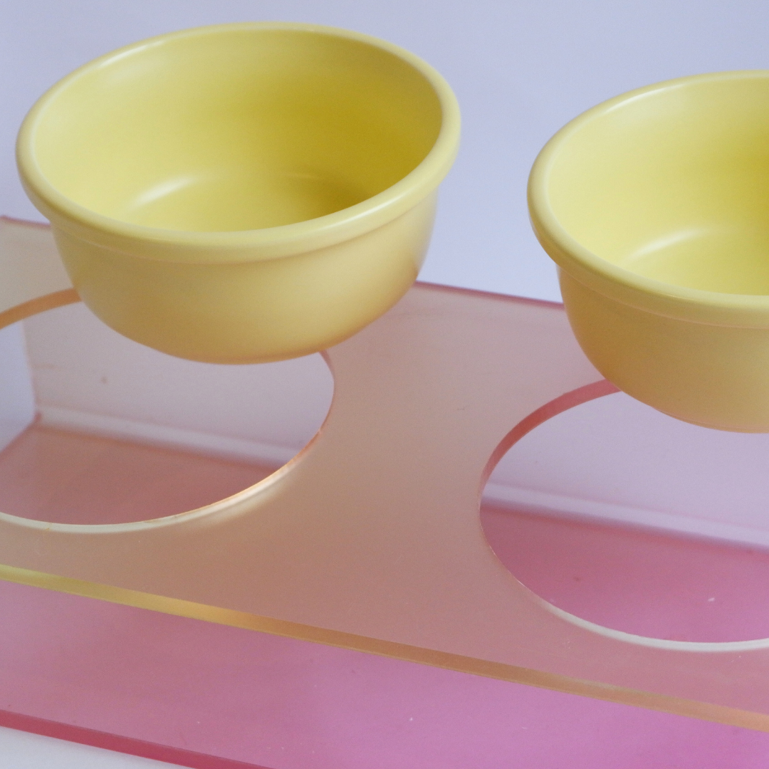 The jell-o bowls are a design variant of the jelly bowls. The jell-o's are designed to be leveled instead of the classic tower design. Our newly designed modern, minimalist, and jelly-ish gradient colored bowls can bring life to your room but still easily match with any home decor. This bowl is elevated and helps stop the swimming/digging behavior especially in their water bowls. Its ergonomic design may also help improve posture and possible neck pain while feeding.