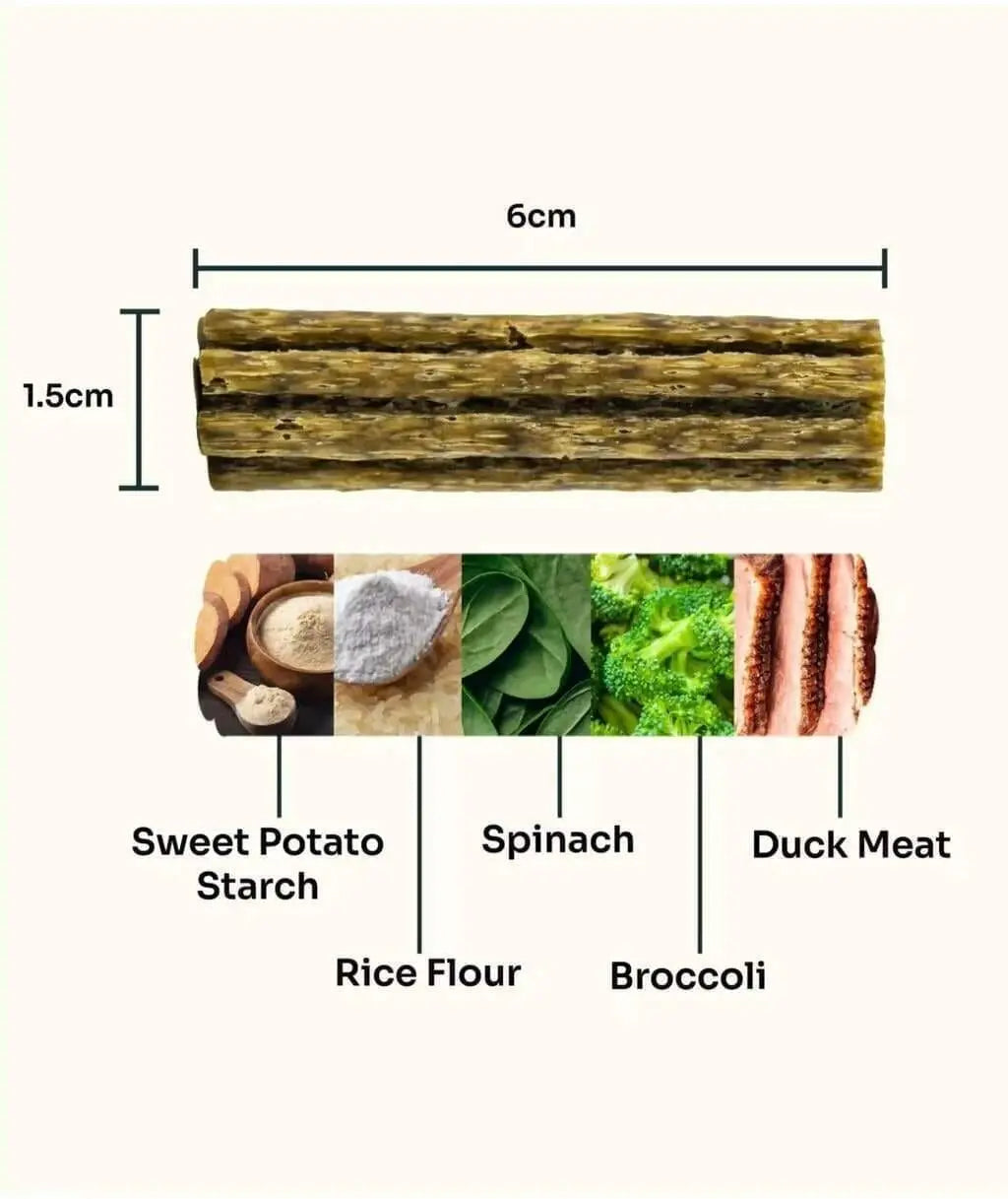 Sweet Potato Starch, Rice Flour, Spinach, Broccoli, Duck Meat, Glycerin, Vitamin E, Tea Polyphenols